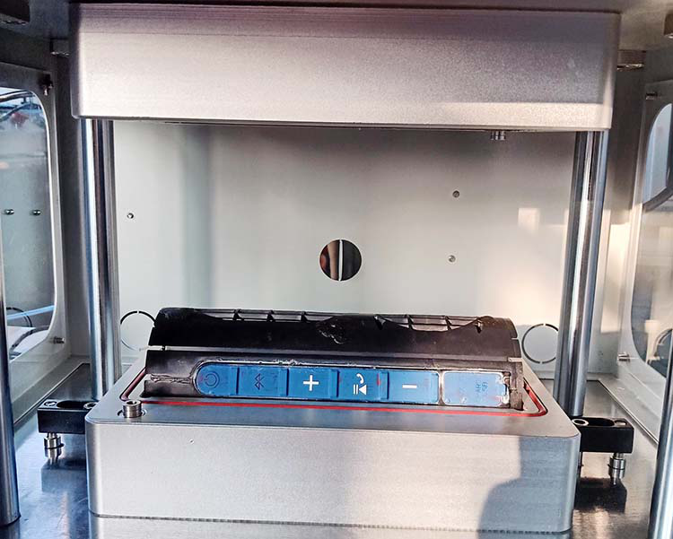 檢測方法:間接測試方法,將產(chǎn)品放入模具中,上下模具閉合,產(chǎn)品四周圍全部密封,進行測試,測試壓力11.3KPA,充氣時間7秒,穩(wěn)壓時間7秒,測試時間8秒,泄漏值100PA。